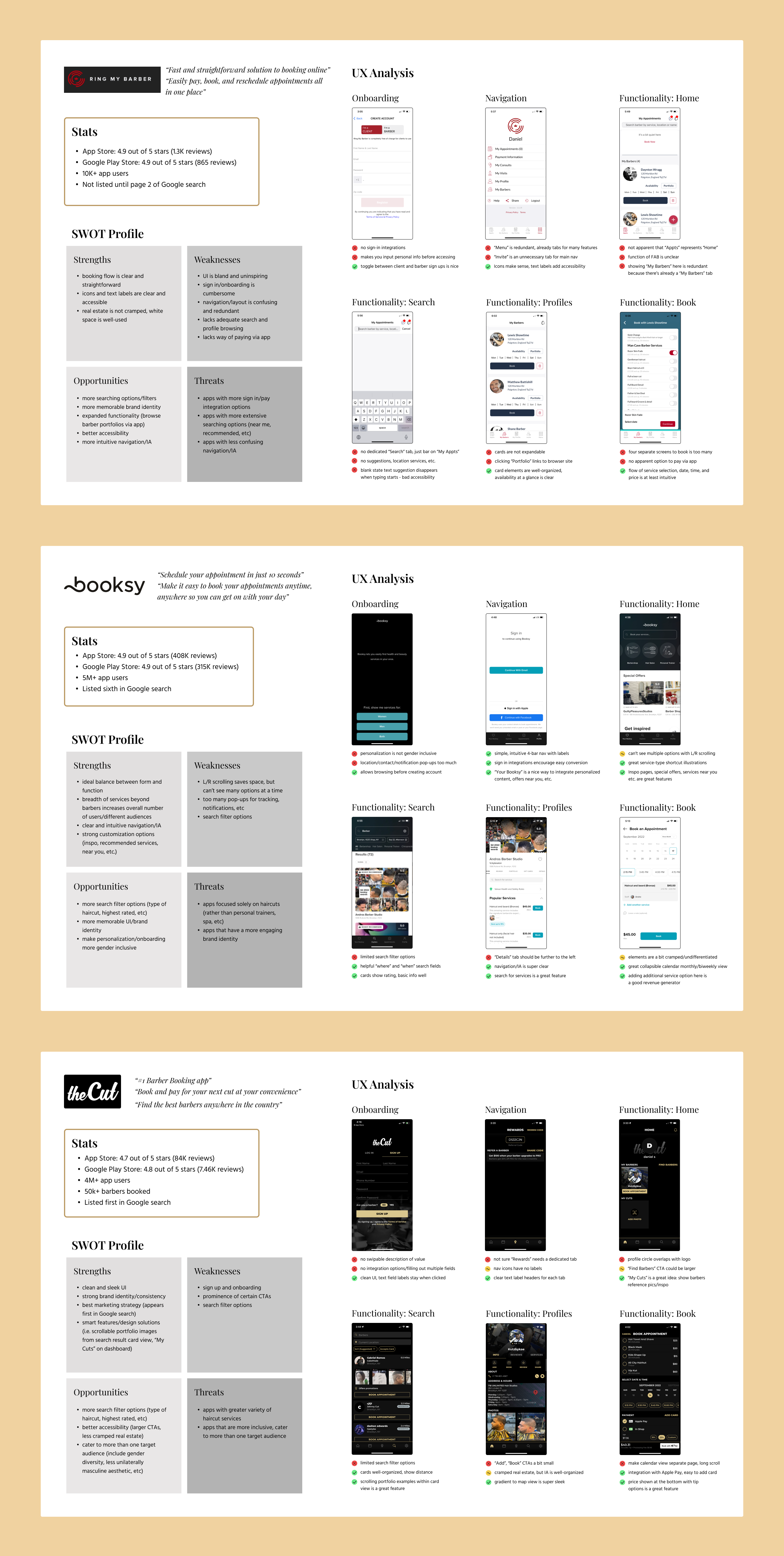 As part of this discovery phase, I selected three barber scheduling apps currently in the market representing a breadth of approaches and number of users, and conducted a competitive analysis, noting strengths, weaknesses, and opportunities compared to Book Me Barber’s current iteration. I decided to focus specifically on the client side for this first phase of study.