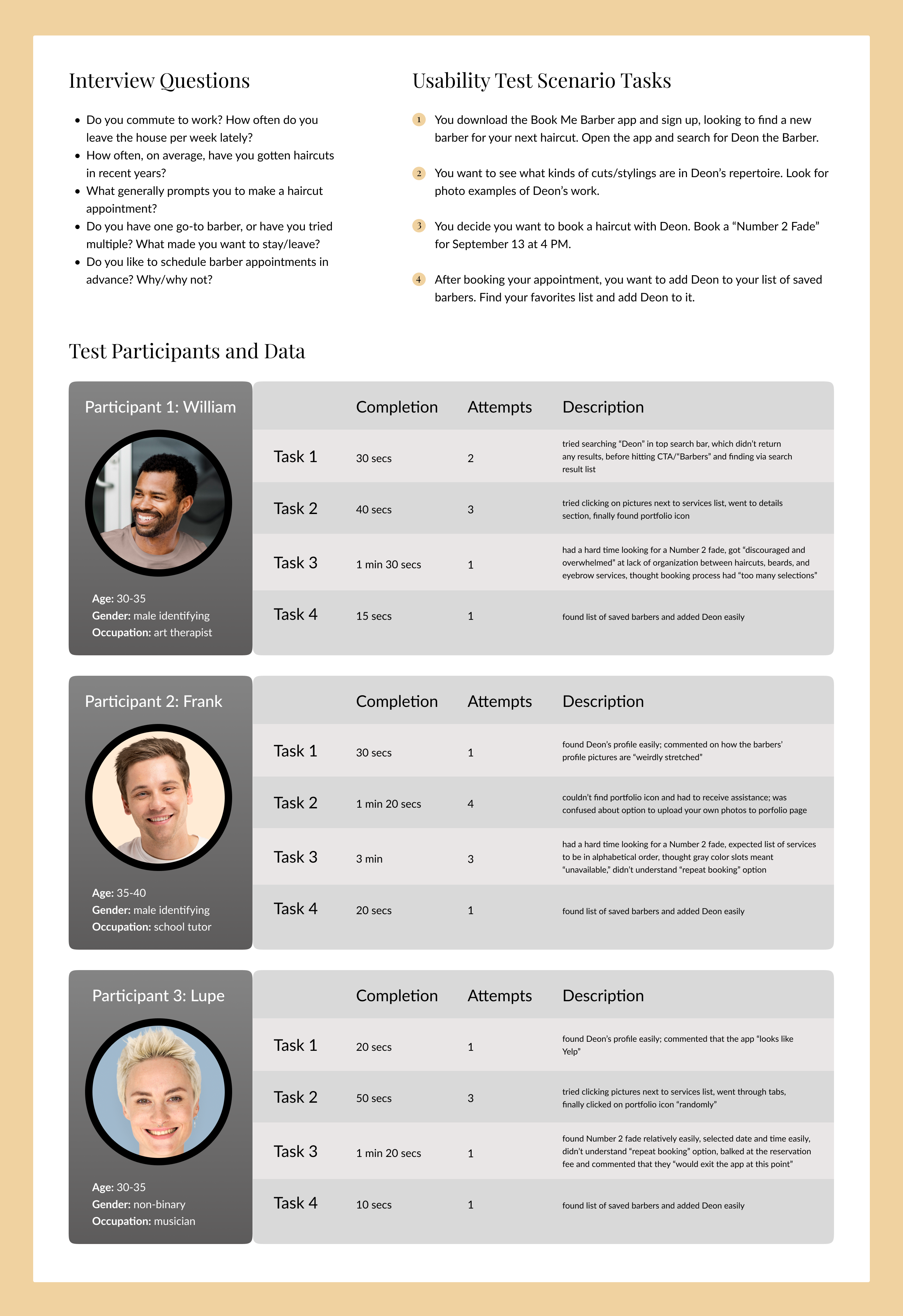 In order to understand more clearly the motivations and pain points of BMB’s target users, I recruited three participants to do some initial interviews and usability testing with the current BMB app. I created five interview questions with the aim of learning about each participant’s context and what trigger event(s) led them to seek/book a haircut - aka the WHEN and WHERE. I then led each participant through a moderated in-person usability test consisting of four short scenario tasks on the current BMB app, measuring task completion times, success rates, and oral feedback.