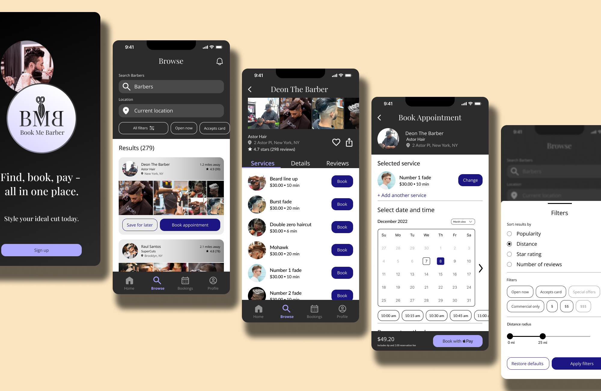 During my last haircut, I asked Deon how things were going with Book Me Barber. He said, “you know, things are slow.” He’s only had the help of a single developer, and simply hasn’t had the time to scale up the app’s roster of barbers and the clients that come with them. I told him about being a UX Designer and, long story short, he agreed to let me take a look at the app and come up with a few ideas for improvement.