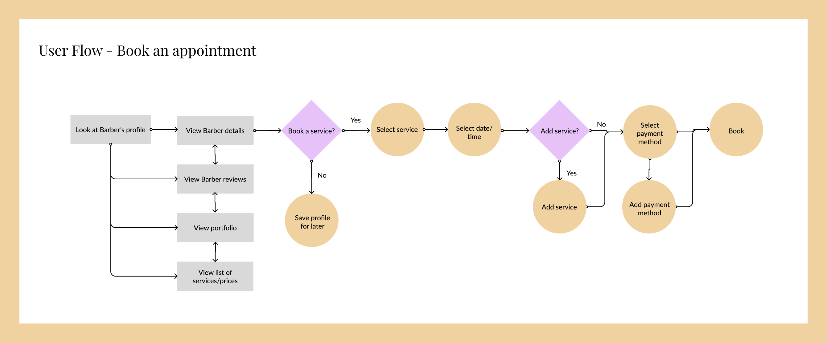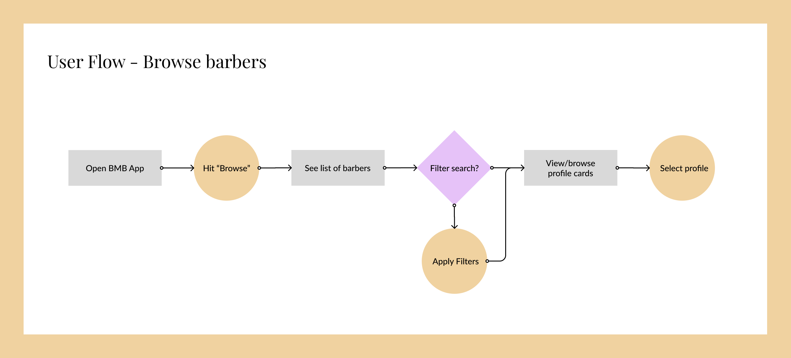 My final step before taking a stab at redesigning Book Me Barber's mobile screens was to create two user flows encapsulating the app's core functionality: browsing barbers and booking an appointment with a selected barber. These flows allowed me to visualize the most efficient path towards users' goals and consider what possible actions users might want to make at each juncture.