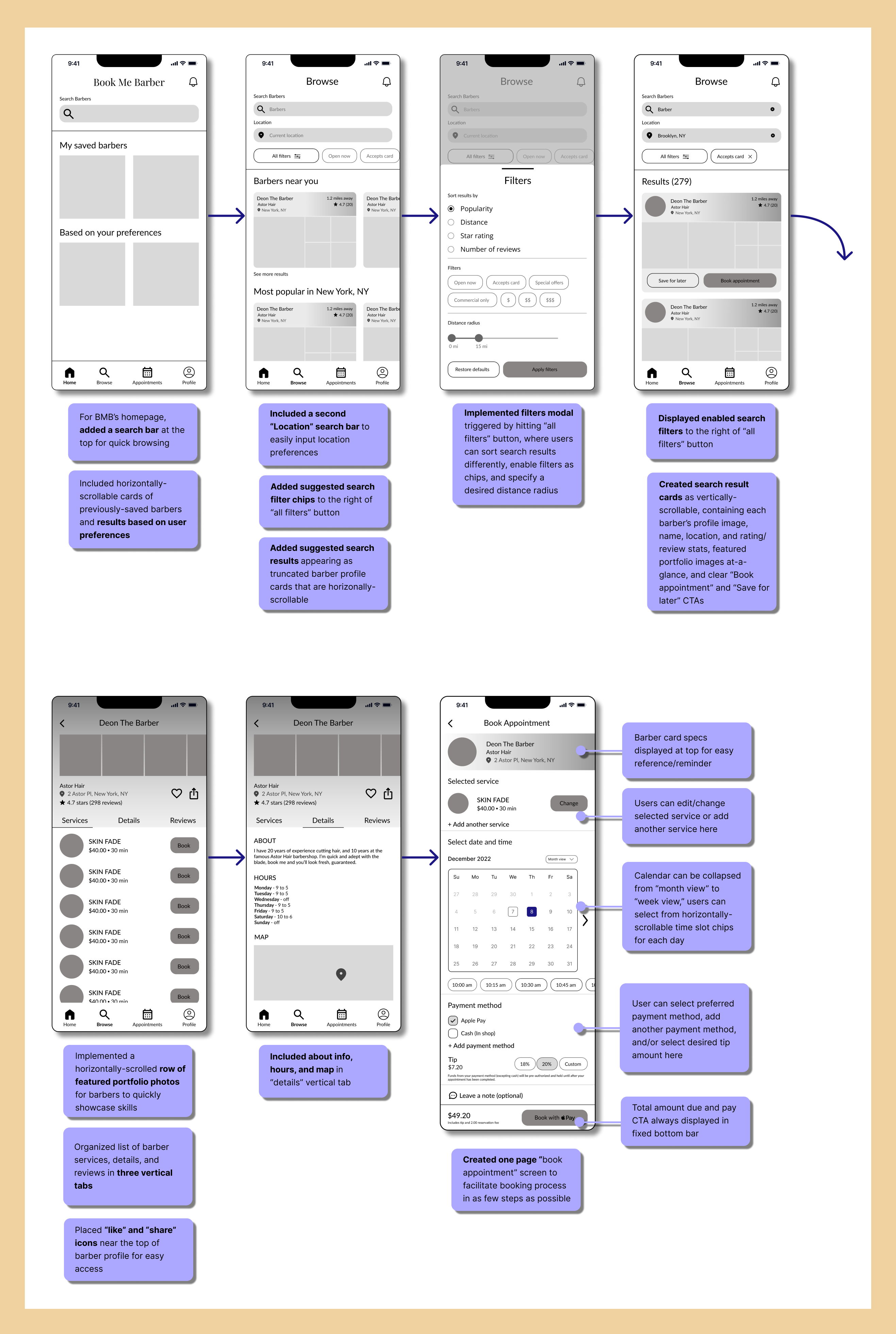 Finally, I was ready to tackle the WHAT - the proposed reimagining of the Book Me Barber client-side mobile app. I designed wireframes corresponding to the above user flows, taking into consideration both the competitive analysis and user testing I'd already completed. In particular, I drew from previous research in order to imagine what information users would want to see when filtering search results, browsing barber profiles, choosing which barber to book an appointment with, and completing their booking seamlessly. Check out the graphic below to view my design decisions in more detail:
